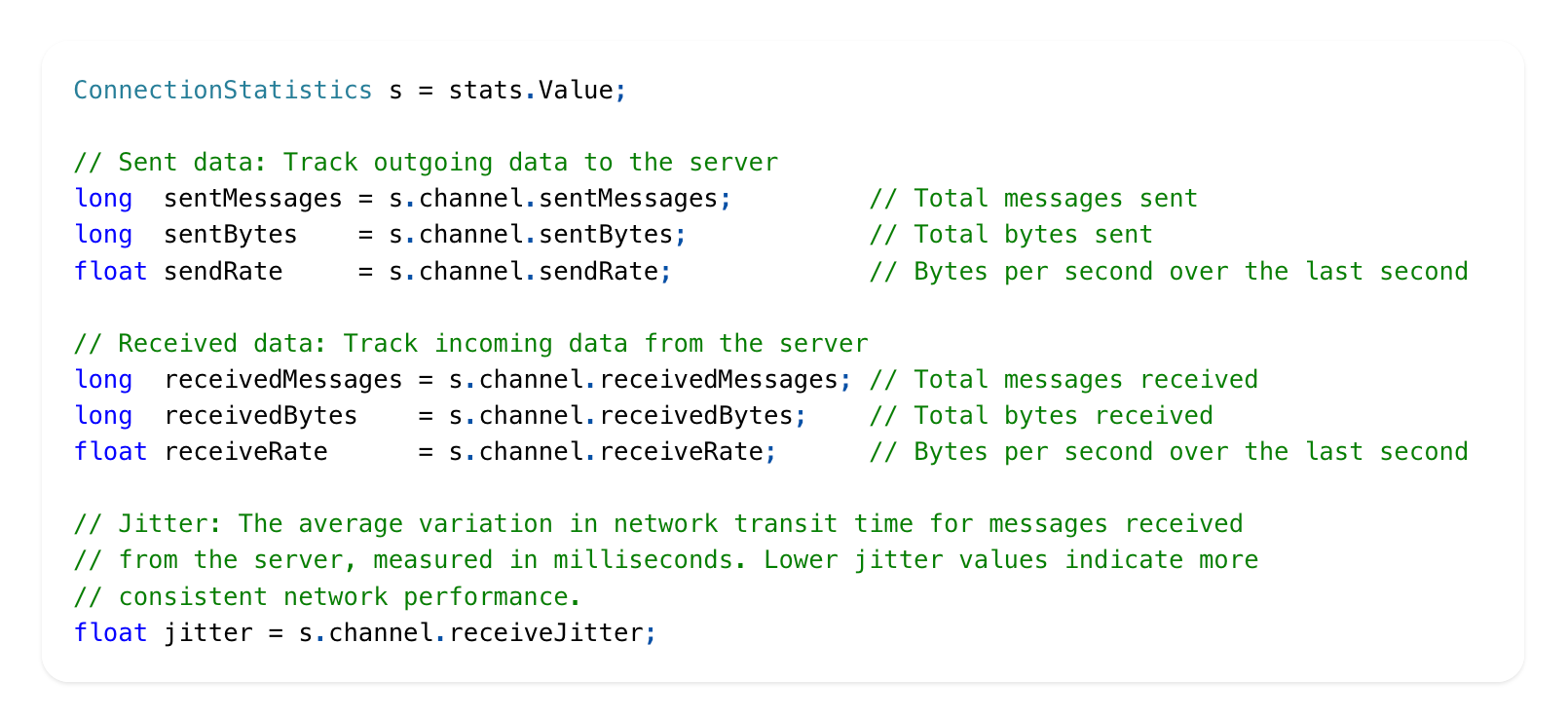Use it at runtime for matchmaking to determine if clients have a poor connection, debug connection issues in the field, or report connection stats to analytics.